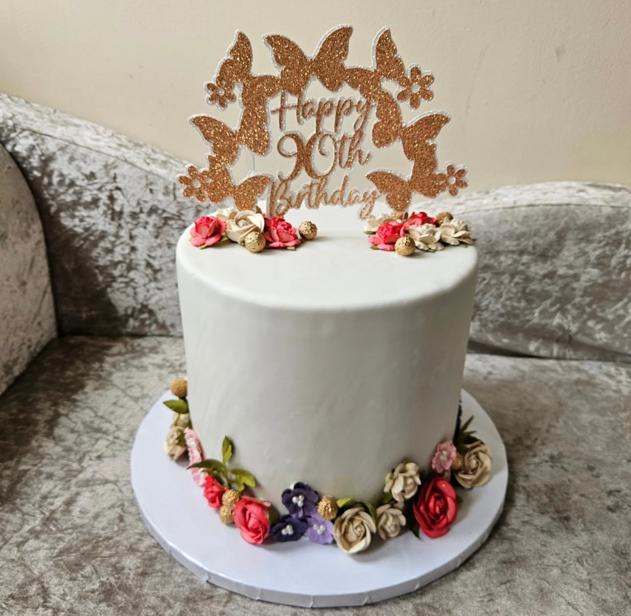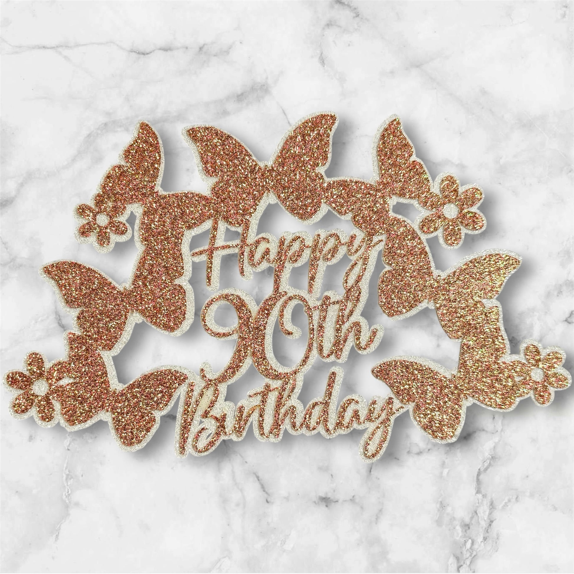 A beautiful 3D layered glitter card topper featuring an elegant butterfly arch design — perfect for milestone birthdays and special celebrations. Available in your choice of colours and age. Made with premium glitter card and attached to clear acrylic sticks.