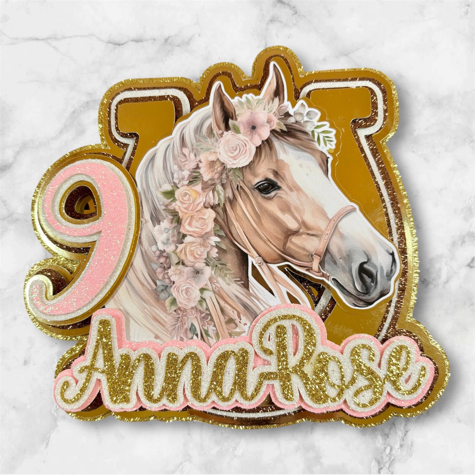 Glitter card cake topper with hand rolled paper flowers, personalised with any name and age and made to fit your cake size. Attached to a clear acrylic stick.