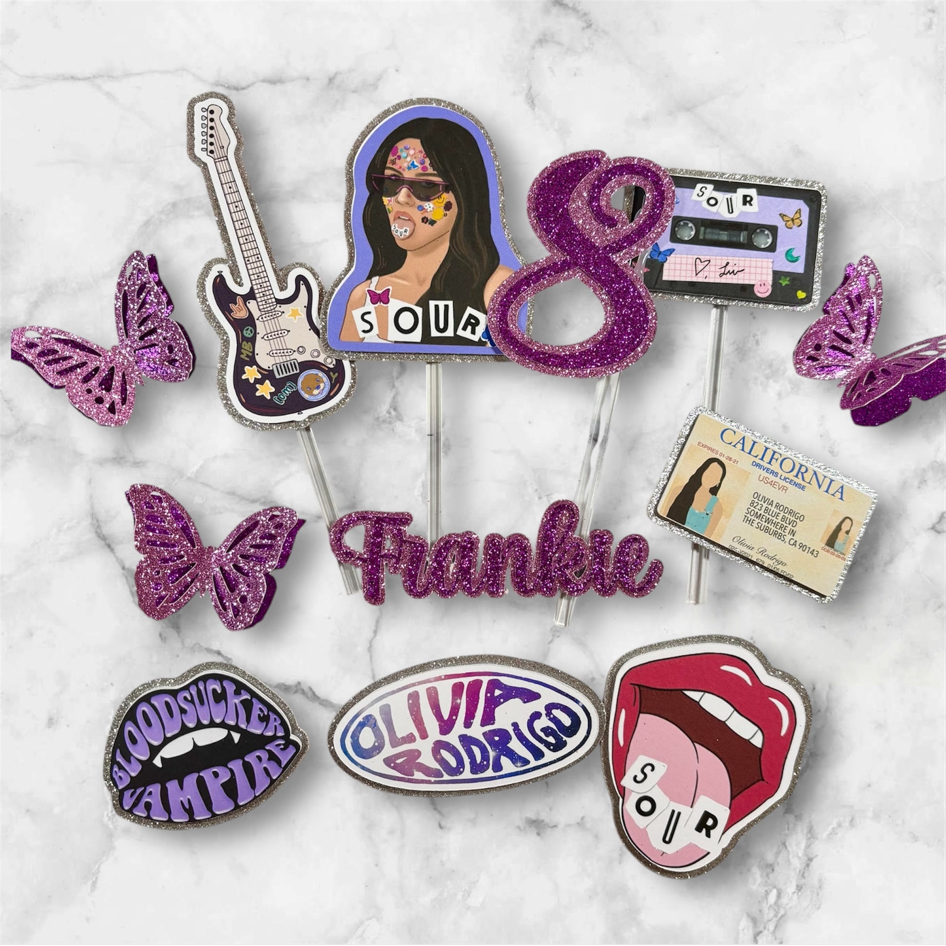 This set includes some toppers on sticks and some without to go around the cake. Made with glitter card.