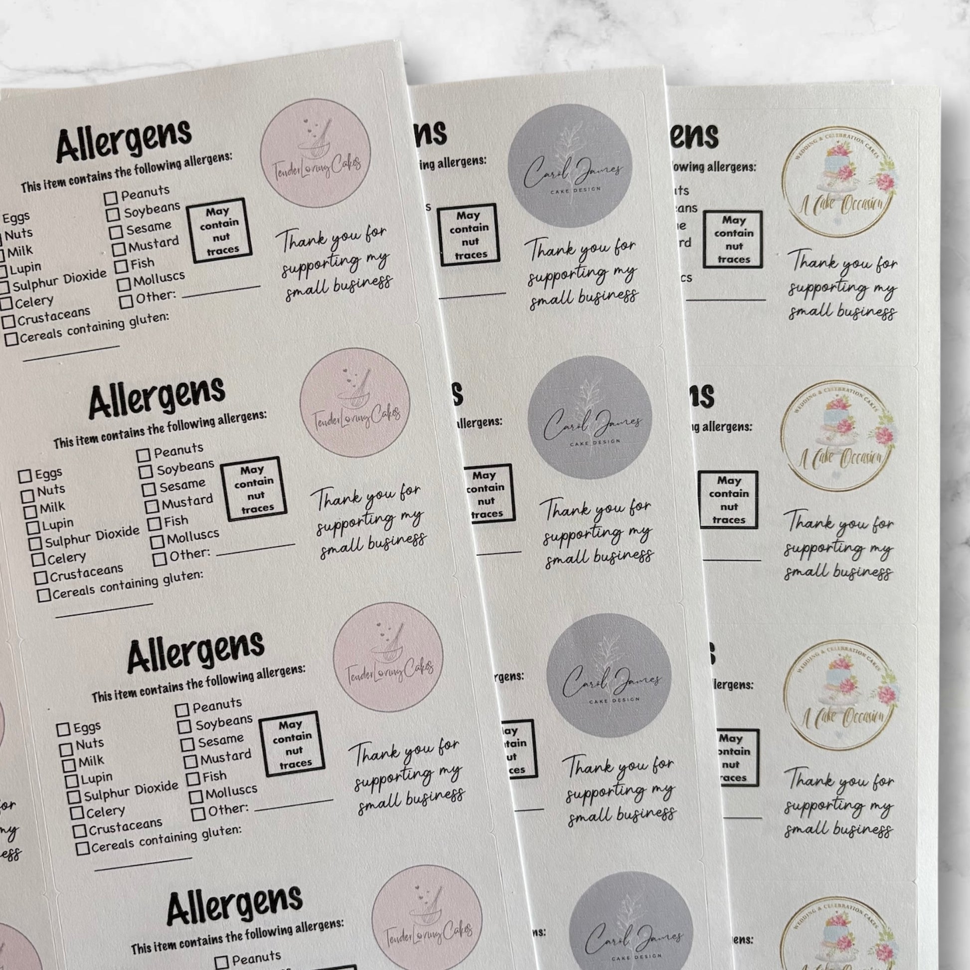 Printed on white matte stickers, they are not waterproof. 10 stickers per sheet, size: 4 inches x 2.5 inches. Includes all 14 allergens. Personalised with your business logo or name. Logos need to be sent via email: caketoppersbychloe@yahoo.com please include your order number. Logo format needs to be a PDF, PNG or JPEG, ensure your logo is a clear image for the best printing results.