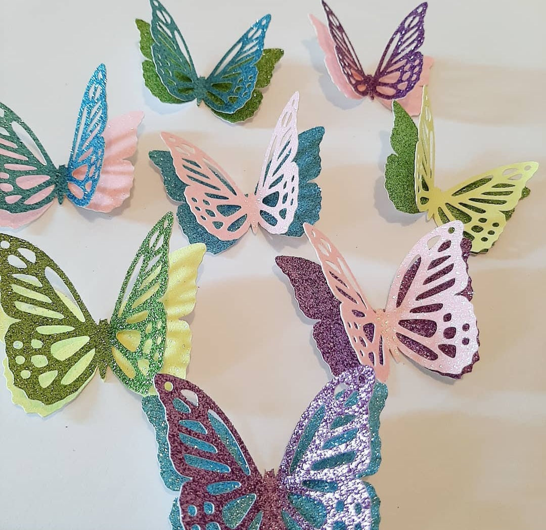 This set includes: rainbow unicorn topper, with a unicorn and fairy on the clouds, 8 butterfly card toppers without sticks, two fairies and two unicorns without sticks, as well as a matching name and age charm without sticks. Elevate your cake with this gorgeous glitter card cake topper set! Made to fit your cake size and with your personalised text.