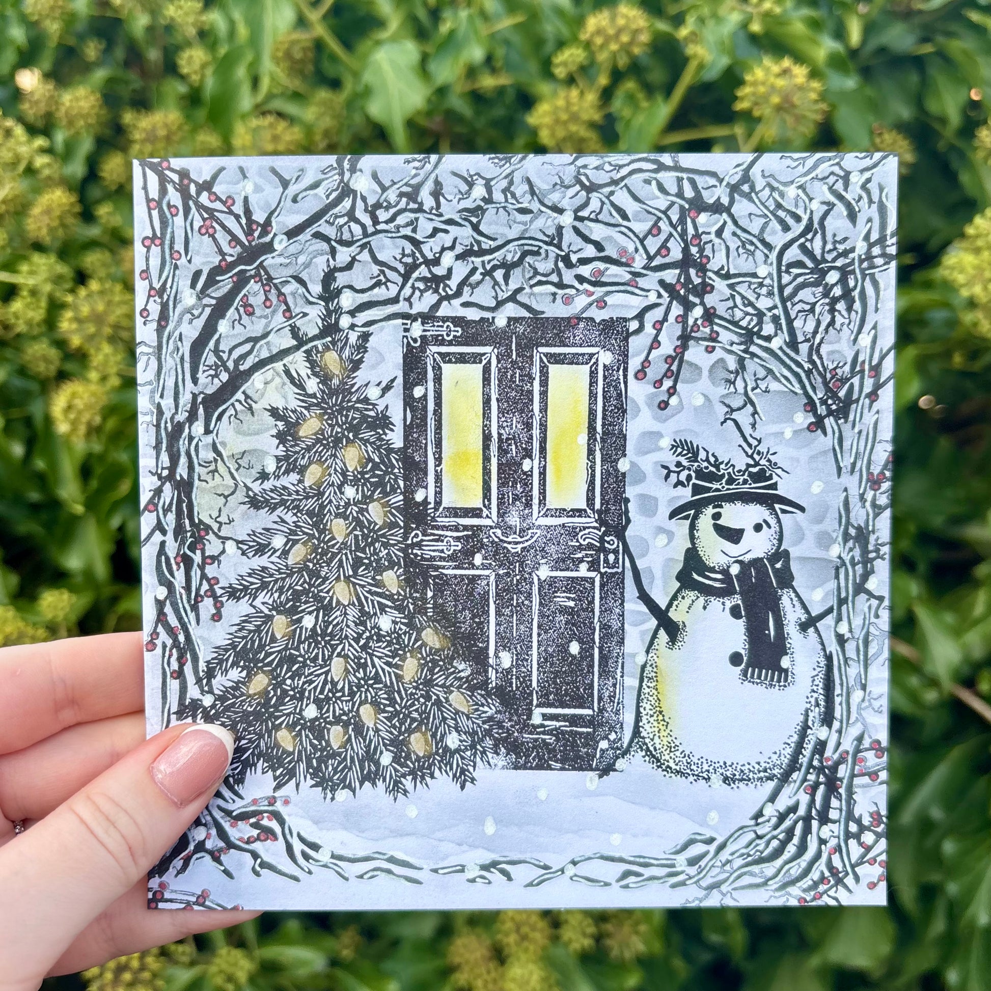 Each card is hand stamped to create a one-of-a-kind design, built up layer by layer using individual stamps and inks to form a beautiful scene. No two cards are ever exactly the same, making each one a truly special keepsake.